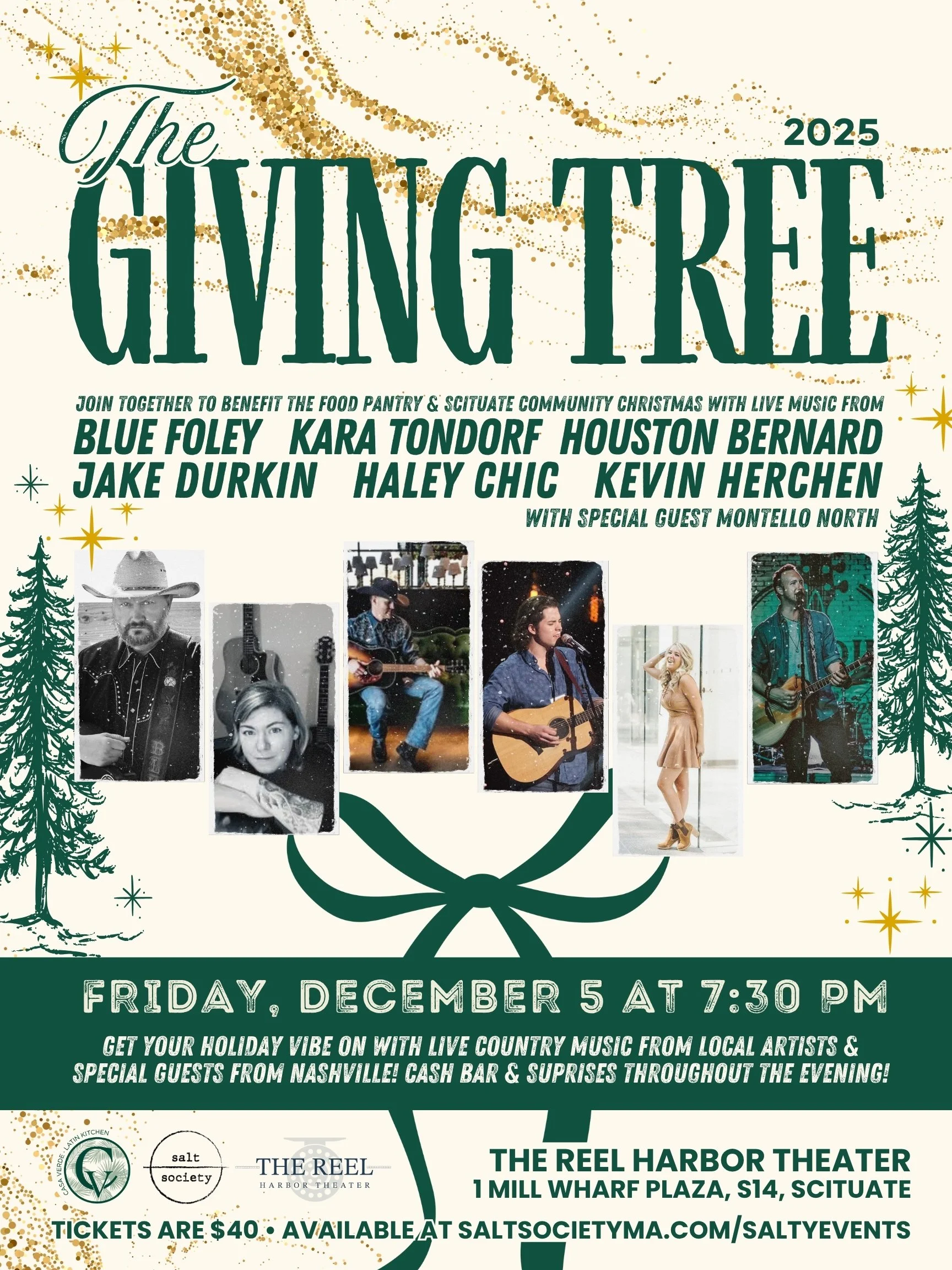 Are you asking yourself what you can do to help others for the Holidays this season? Let us do all the work! This year the Scituate Food Pantry and Scituate Community Christmas need more help than ever. All you have to do is show up and enjoy a wonderful evening full of community, love, joy, giving and exceptional holiday and original music with special local guests, and special Nashville guests! The evening will be held at the Reel in Scituate Harbor on Friday December 5th at 7:30 PM. Cash bar available. If you bring Target or Amazon gift cards in increments of $10 you will receive 2 raffle tickets per $10 gift card for an opportunity to win some amazing prizes!